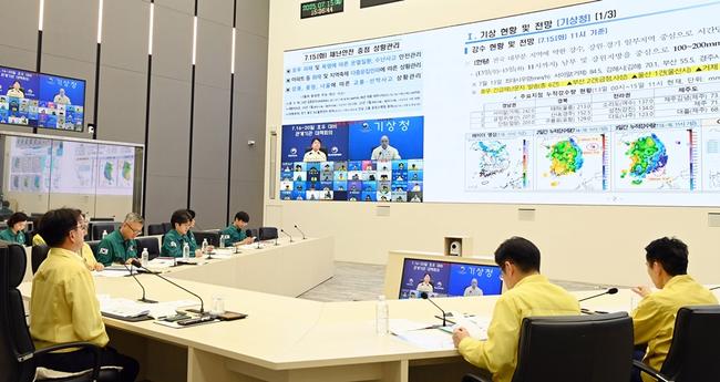 김광용 행정안전부 재난안전관리본부장이 지난 15일 정부세종청사 중앙재난안전상황실에서 호우 대비 관계기관 긴급 대책회의를 주재하고, 피해 우려 지역을 중심으로 인명피해 예방 및 수해 방지 대책을 중점 점검하고 있다.