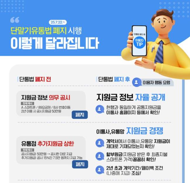 방송통신위원회(위원장 이진숙)와 과학기술정보통신부(장관 배경훈)는 “단통법 폐지로 지원금 공시 의무는 사라지지만 이동통신사들은 이용자에게 정확한 정보를 제공하기 위해 자율적으로 요금제별, 가입유형별 지원금을 기존과 동일하게 누리집 등을 통해 공개하기로 했다”고 밝혔다. 이용자들은 개별 유통점을 통해 추가지원금을 포함한 총 단말기 지원금 정보를 안내받을 수 있다.