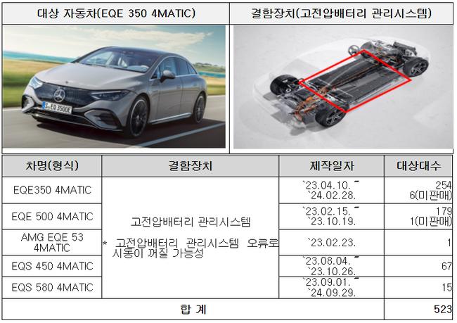 벤츠 E 350 4MATIC 16,957대는 엔진제어장치 소프트웨어 오류로 인해 주행 중 시동이 꺼질 가능성이 확인됐다. 또한 EQE 350 4MATIC 등 5개 차종 523대는 고전압배터리 관리시스템 소프트웨어 문제로 시동이 꺼질 가능성이 있어 7월 25일부터 리콜을 진행하고 있다.