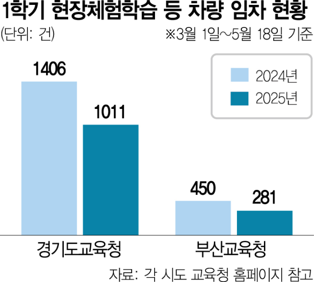 입부 언론의 보도를 따르면, 지난해 계획되거나 완료된 현장체험학습은 약 6,882건이었으나, 올해는 4,342건으로 약 36% 감소했다. 서울경제 보도에서는 상반기 차량 임차 용역비 지급 현황을 분석한 결과 150~200건 가까이 감소한 것으로 나타났다. 또한 경북 교육청의 수련활동·수학여행 건수도 절반 수준으로 줄었다.