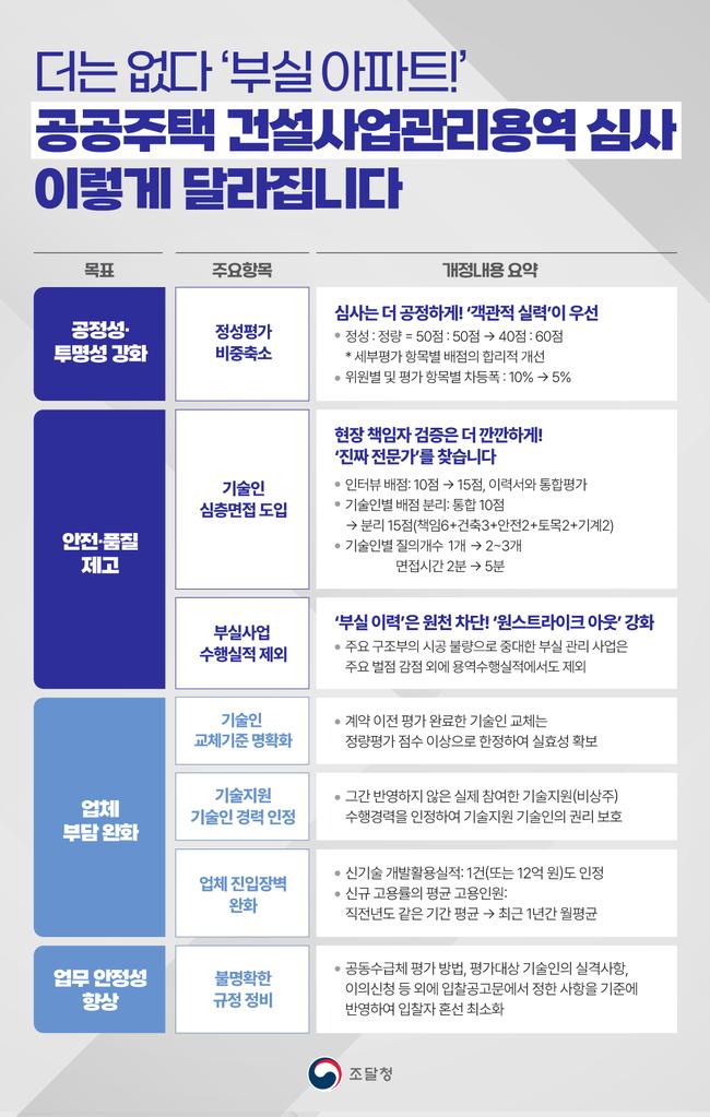조달청, 공공주택 건설 심사규정 전면 개편…안전·품질 강화 - 정성평가 비중 줄이고 정량평가 확대, 공정성 확보 - 기술인 심층면접·부실 실적 배제 등 안전·품질 강화 - 신생업체 기회 확대, 기술인 교체기준 명확화로 부담 완화