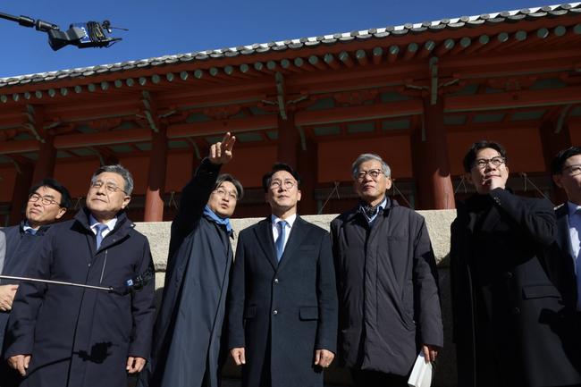 김민석 국무총리가 10일 서울시의 종묘 앞 고층건물 허용과 관련 허민 국가유산청장, 유홍준 국립중앙박물관장 등과 함께 종로구 종묘를 방문, 외부 조망을 점검하고 있다.
