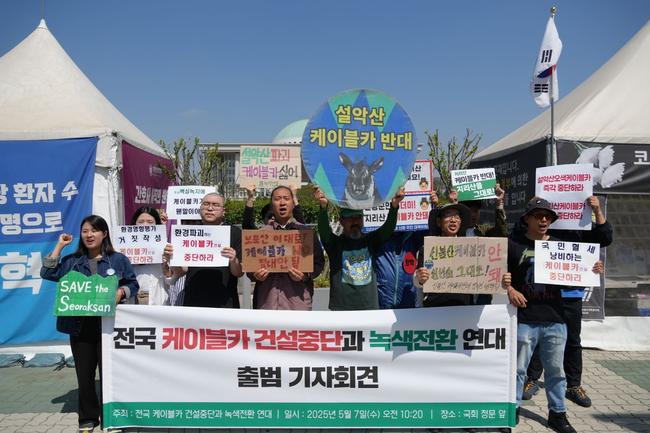 전국 11개 지역의 시민단체와 정당이 5월 7일 국회 앞에서 기자회견을 열고, 전국 16곳에서 추진 중인 케이블카 건설 사업의 전면 중단과 대선후보의 관련 공약화를 촉구하며 ‘전국 케이블카 건설중단과 녹색전환 연대’를 공식 출범시켰다.